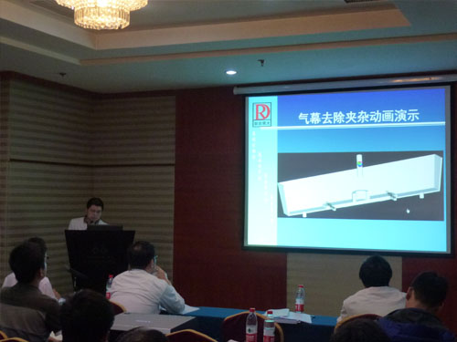 大會上董事長章榮會博士,耐材研究所所長鄧樂銳分別做了《煉鋼及連鑄系統(tǒng)用不定形耐火材料最新技術(shù)進展》、《氣幕擋墻及中間包流場優(yōu)化》報告。針對聯(lián)合榮大集團近幾年圍繞煉鋼和連鑄系統(tǒng)自主研發(fā)的轉(zhuǎn)爐環(huán)保型“水基”大面自流料、轉(zhuǎn)爐遙控噴注技術(shù)、鋼包遙控噴注修筑技術(shù)、金屬陶瓷預(yù)制件及潛在應(yīng)用、中間包自固化干振料、中間包氣幕擋墻等新產(chǎn)品和新技術(shù)做了詳細介紹,得到與會者的普遍關(guān)注。
