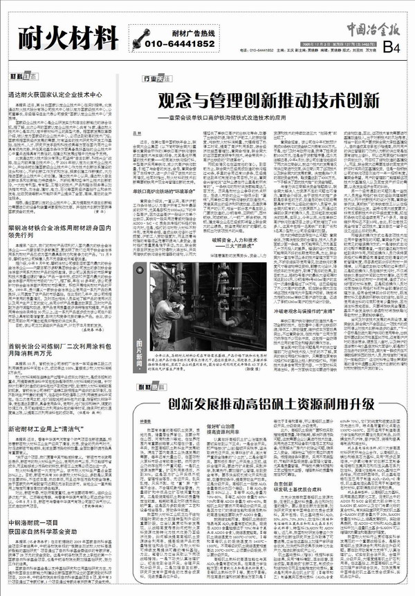 當(dāng)問(wèn)及該技術(shù)的未來(lái)設(shè)想,章榮會(huì)說(shuō),聯(lián)合榮大不會(huì)因這么一項(xiàng)技術(shù)的成功而停止對(duì)技術(shù)創(chuàng)新與進(jìn)步的追求!跋乱粋(gè)目標(biāo)是改進(jìn)大高爐鐵溝的使用壽命,出鐵目標(biāo)要達(dá)到30萬(wàn)噸甚至50萬(wàn)噸。還有高爐爐襯的濕法噴涂、硬質(zhì)壓入造襯,以及轉(zhuǎn)爐的濕法噴補(bǔ)與水基自流料大面修補(bǔ),都是我們正在進(jìn)行的研究項(xiàng)目。聯(lián)合榮大有一群成天在不停思考新東西的技術(shù)人員,我相信我們有實(shí)力一定能成功!”這位材料專業(yè)博士聲調(diào)漸高的語(yǔ)句中透露出其對(duì)技術(shù)創(chuàng)新的熱情和對(duì)耐材新技術(shù)開(kāi)發(fā)的信心。